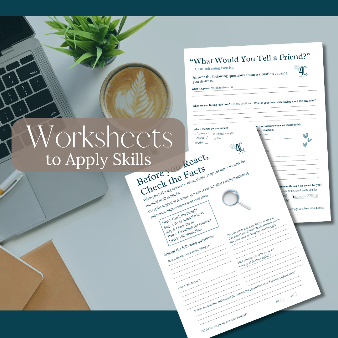 I believe that support should be offered when it is needed, not when it is scheduled. For this reason, I offer both on demand appointments, as well as weekly scheduled sessions. You choose what feels right to you. Want more than 1:1? I also teach Cognitive Behavioral Therapy (CBT) and Dialectical Behavior Therapy (DBT) techniques and tools to anyone who wants to have more tools to tackle life challenges. Simple, effective, and available anytime, from anywhere through my learning community, 4C Mental Health.